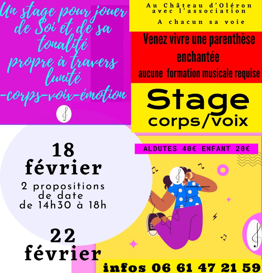 Stage corps et voix avec Muriel , les 18 ou 22 février de 14h30 à 18h .