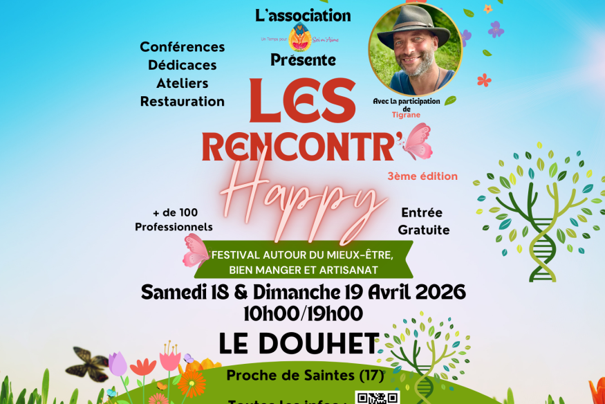Le festival Les Rencontr’Happy revient pour une 3ᵉ édition les 18 et 19 avril 2026, de 10h à 19h, au Parc et salle du Val de la Jarretière à Le Douhet, près de Saintes.