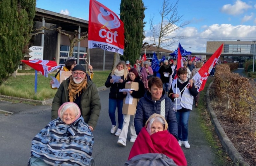A Marennes-Hiers-Brouage, une manifestation des salariés de l'hôpital local ce mardi 25 novembre 2025 . Un mouvement de grogne à l’initiative de la CGT pour dénoncer la dégradation des conditions de travail. Des résidents et leurs familles ont également manifesté aux côtés des agents de la maison de retraite pour exprimer leur ras-le-bol. En cause : la mise en place par la direction en 2024 d’un plan de performance qui a abouti à la suppression de 17 postes, sur environ 170 personnels, toutes catégories confondus. Résultat: des sous-effectifs et des personnels épuisés, explique Rodolphe Martin, représentant du personnel et délégué CGT. (Photo : DR).