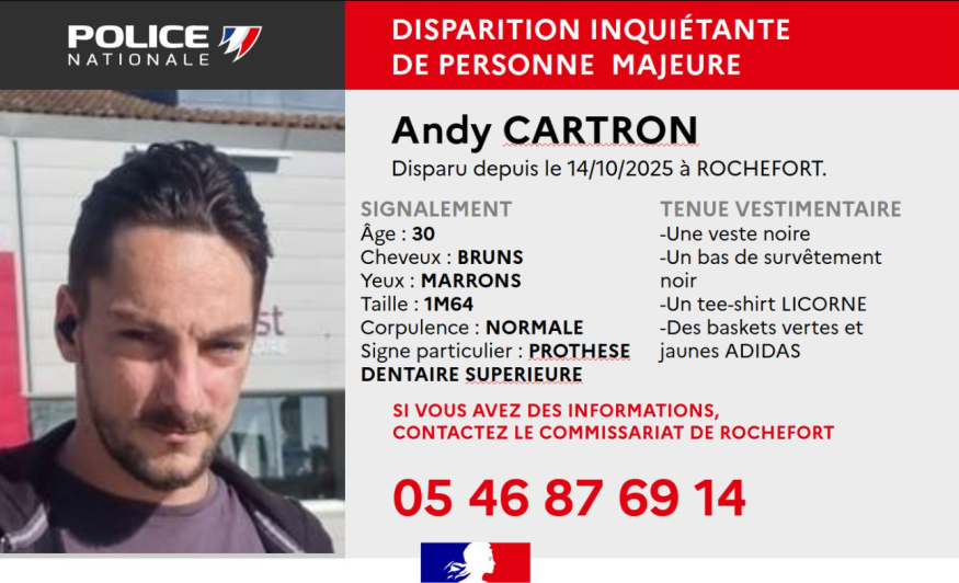 Il s’appelle Andy Cartron, mesure 1 mètre 64, cheveux bruns et yeux marrons, avec comme signe distinctif une prothèse dentaire supérieure. Au moment de sa disparition, il portait une veste et un bas de survêtement noirs, un tee-shirt Licorne, et des baskets vertes et jaunes de marque Adidas.