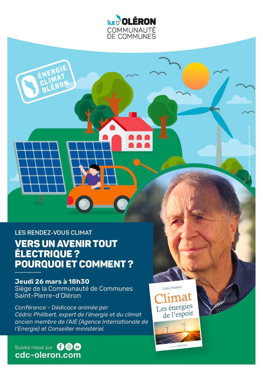 Gratuite et ouverte à tous, dans la limite des places disponibles, cette conférence se tiendra le jeudi 26 mars à 18h30 à Saint-Pierre d’Oléron dans les locaux de la Communauté de Communes. Cédric Philibert viendra éclairer les participants sur les défis et opportunités d’un avenir tout électrique, en lien avec les objectifs de réduction des émissions de gaz à effet de serre et de souveraineté énergétique.